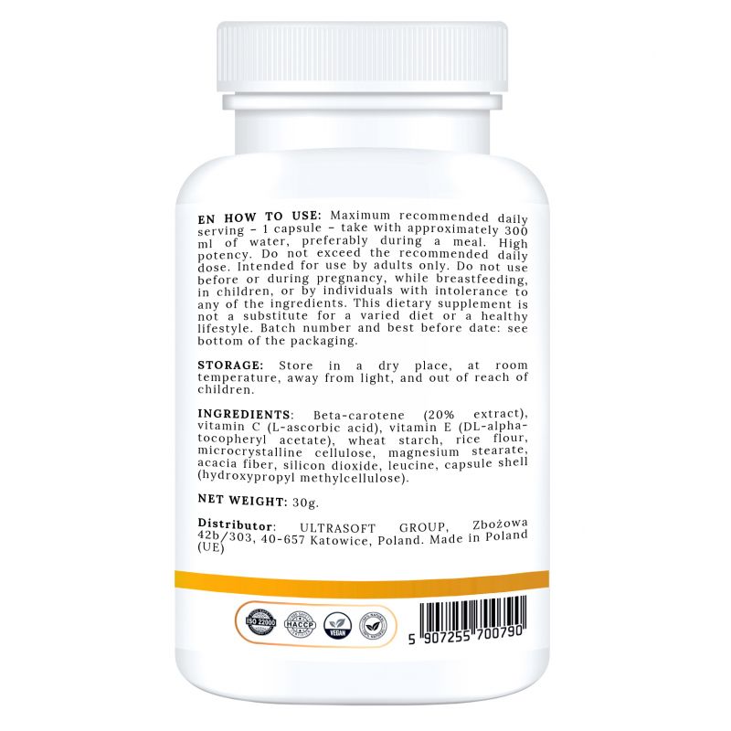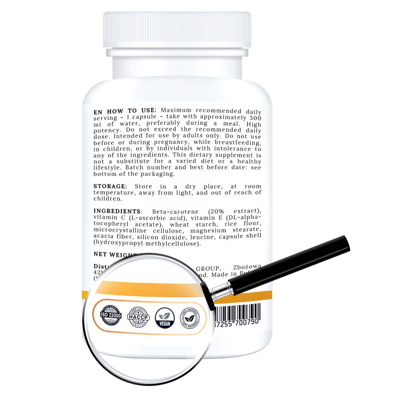 BETA CAROTENE 25000 IU + Witamina E + C to codzienne wsparcie zdrowia, które warto mieć zawsze pod ręką. Jeśli szukasz skutecznego, naturalnego i sprawdzonego suplementu, który zadba o Twoją skórę, odporność i wzrok – ten produkt jest właśnie dla Ciebie. Zadbaj o siebie kompleksowo, od środka.