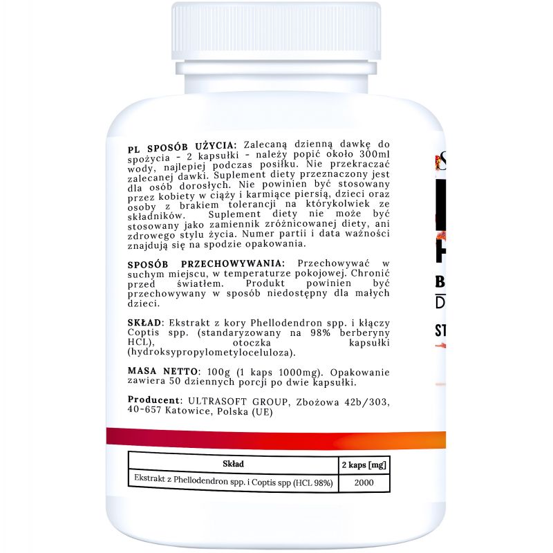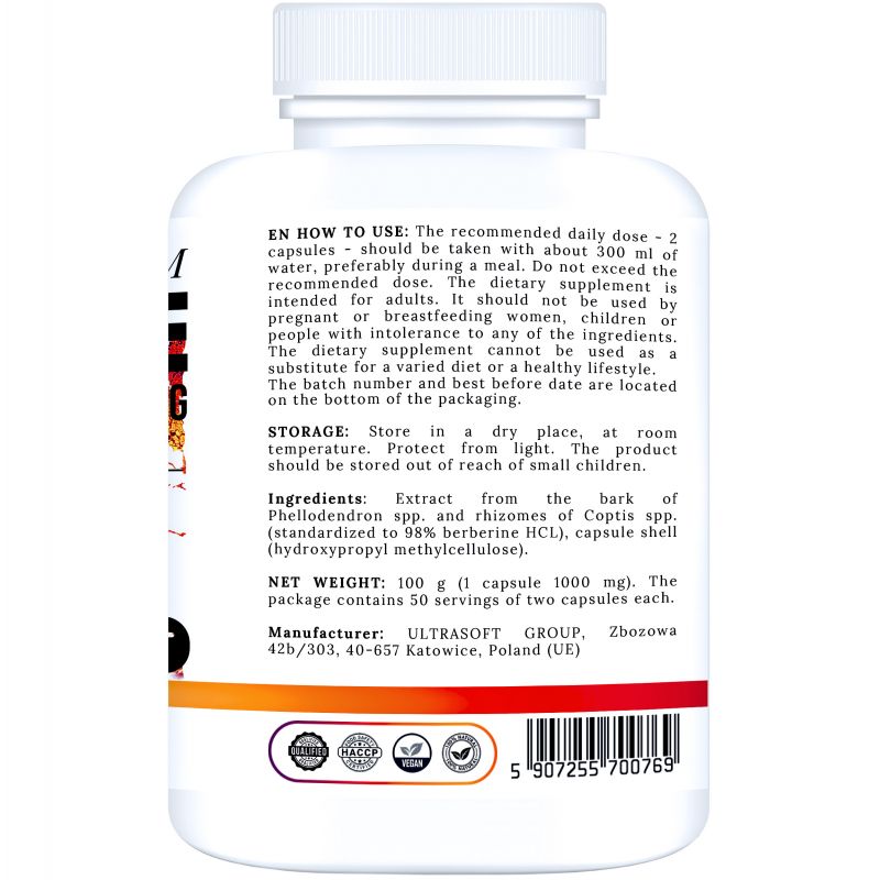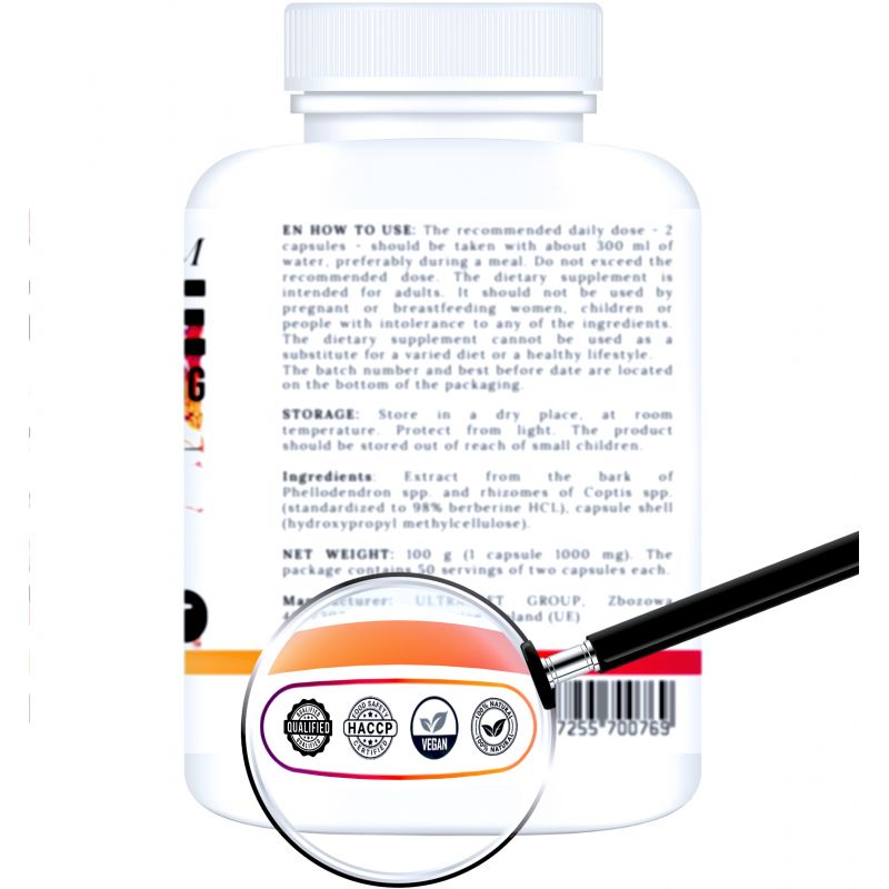 Skład jednej kapsułki: 1000 mg ekstraktu berberyny HCL standaryzowanego na 98% (Phellodendron spp., Coptis spp.), kapsułka roślinna HPMC.
